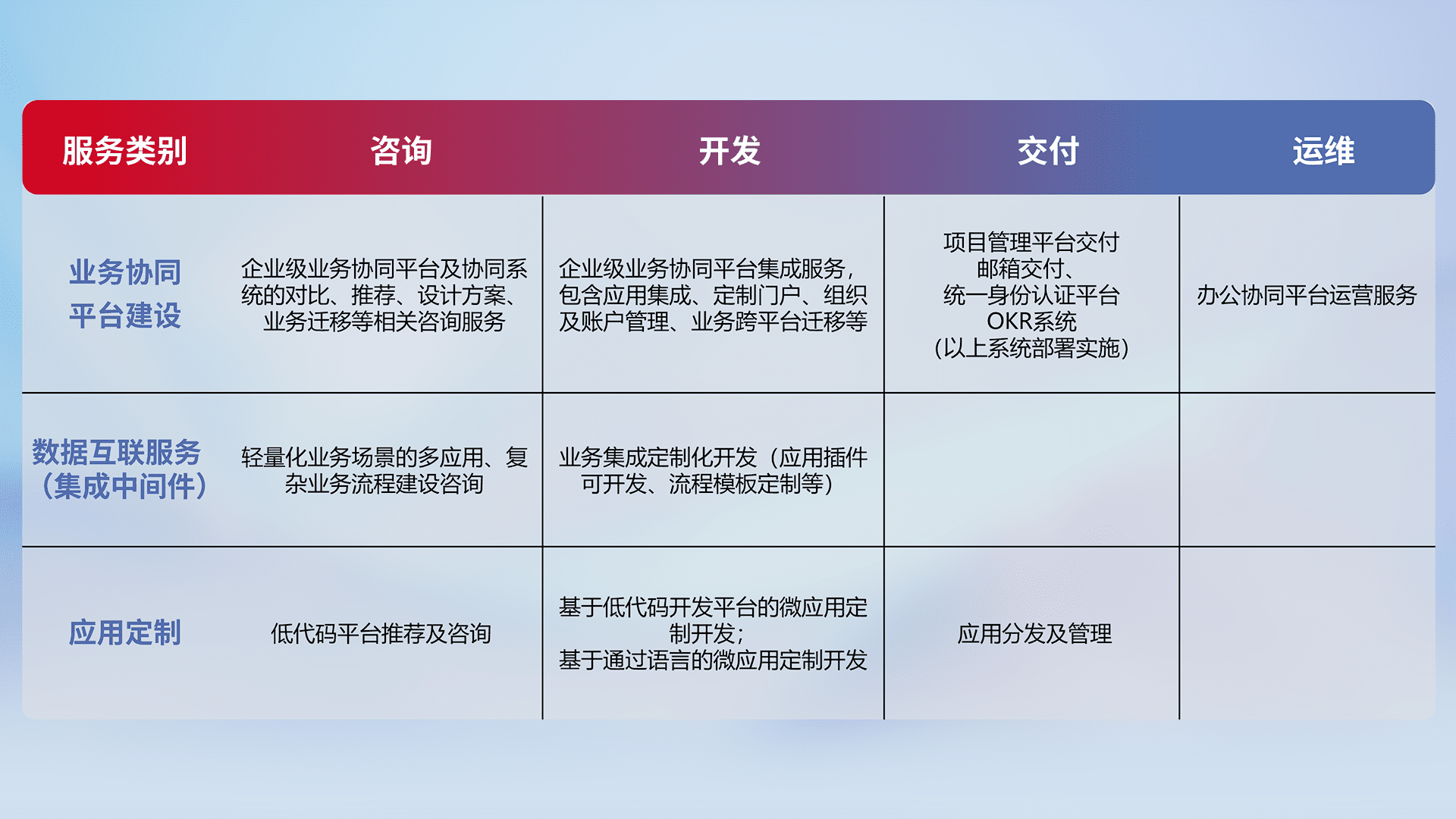 针对钉钉、、企微、、IDaas等平台级产品提供产品的规划、、、方案、、、、交付、、定制化开发等服务,,实现如统一协同办公、、、、智能客户服务、、混合会议管理、、智能数据查询、、等业务场景,,,实现数字化转型。。