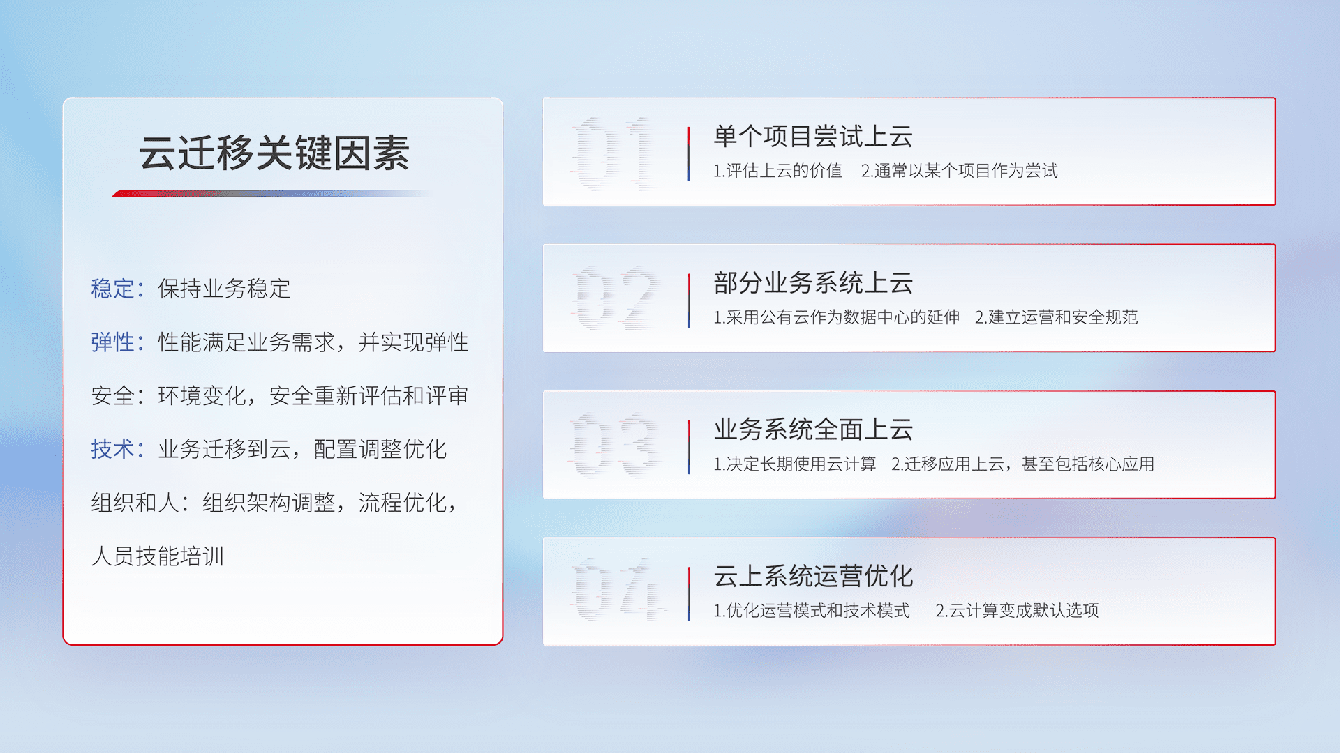 结合实际业务,,从规划设计、、、云平台选型、、、云原生改造、、数据迁移、、集成交付,,,,迁移全过程为客户识别最佳上云路径,,,做好风险识别管理,,设计网络架构、、身份权限、、、安全审计合规、、、操作审计、、、日志审计、、、、监控告警策略、、多站点容灾设计等,,对云上基础设施进行整体规划,,,提升IT治理水平,,以满足弹性、、、、高可用、、、高性能的需求。。。